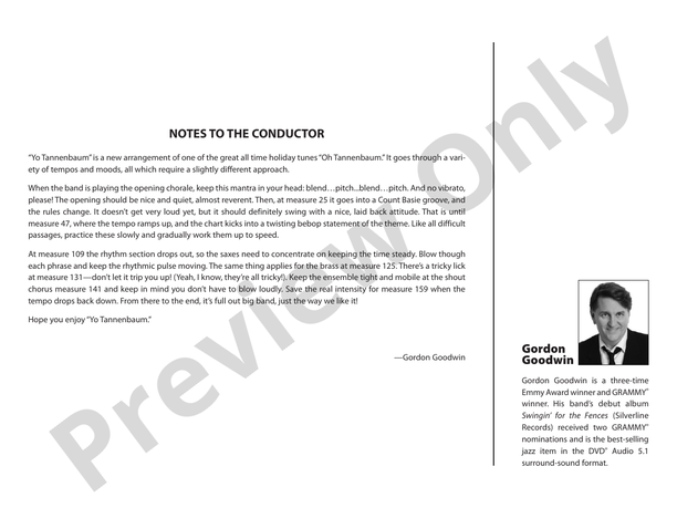 Holiday jazz by Gordon Goodwin. This adaptation of "Oh Tannenbaum" is quite an adventure, offering a chorale, some Basie style, and fast and furious Goodwin bebop. Solo space for alto and tenor sax, trumpet and trombone. Optional flute for 2nd alto sax. Lead alto has either a standard alto part or an optional part for alto with a soprano double. A very exciting chart as performed by the Big Phat Band. (5:29)