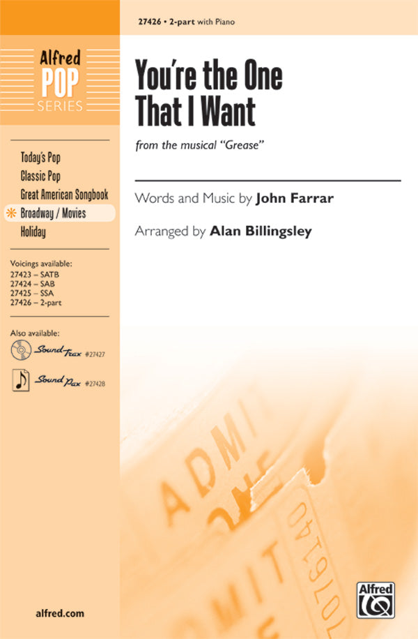 You've seen Grease, the musical, Grease, the movie, and now, "You're the One That I Want," the hit TV show casting the lead roles for the Broadway revival of Grease. So now, sing the hit from the musical, the movie, and the TV show: "You're the One That I Want." It's a hot new choral version, just in time for the Broadway opening. Alan Billingsley's arrangement captures all the excitement of the smash 50s musical. Choreography featured on "Razzamatazz!" DVD (item 00-27430).